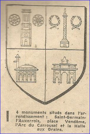 Écartelé: au 1er d'azur au clocher de Saint Germain l'Auxerrois d'argent accosté de deux rosaces d'or, au 2e de gueules à la colonne de Vendôme d'argent accostée de deux couronnes de laurier d'or, au 3e de gueules à la Bourse du Commerce d'argent, au 4e d'azur à l'Arc de triomphe du Carrousel d'argent.