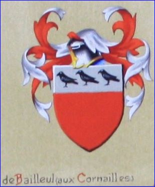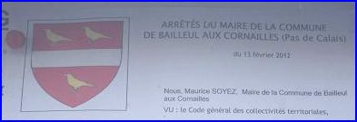 (1990) De gueules à la fasce d'argent accompagnée de trois corneilles d'or.