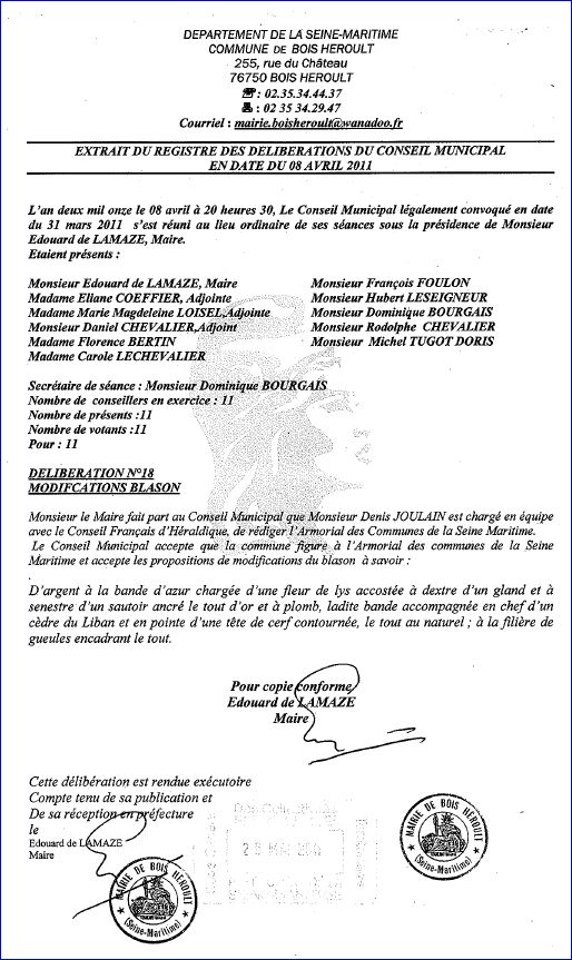 (2011) D'argent à la bande d'azur chargée d'une fleur de lis accostée à dextre d'un gland et à senestre d'un sautoir ancré le tout d'or et à plomb, ladite bande accompagnée en chef d'un cèdre du Liban et en pointe d'une tête de cerf contournée, le tout au naturel; à la filière de gueules encadrant le tout.