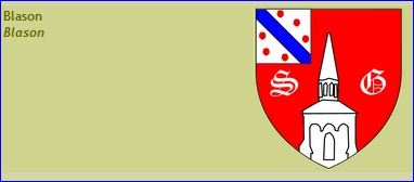 De gueules au clocher du lieu d'argent mouvant de la pointe, accosté des lettres S et G du même; au franc-canton d'argent à la bande d'azur accompagnée de six tourteaux de gueules ordonnés en orle.