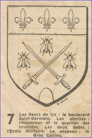 De gueules à deux épées hautes d'argent passées en sautoir, accompagnées en chef et en flanc de trois abeilles d'or et en pointe d'un coupeau d'argent; au chef cousu d'azur chargé de trois fleurs de lis d'or.