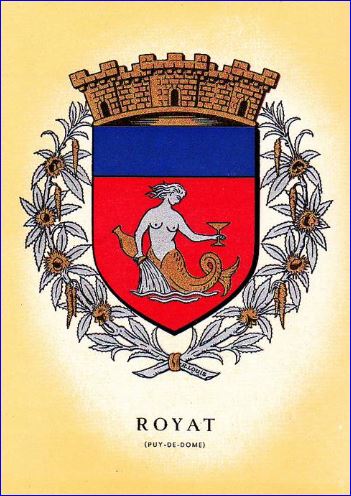 (1957) De gueules à la sirène, la tête contournée d'argent marinée d'or posée sur des ondes d'argent, tenant de la dextre une urne d'or versant de l'eau d'argent et présentant de la senestre une coupe d'or; au chef cousu d'azur plain.