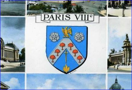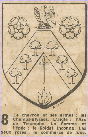 D'azur au chevron d'argent écimé, chargé de six arbres de gueules, sommé d'une aigle de l'Empire d'or, accompagné en chef de deux roses d'argent et en pointe d'une flamme d'or mouvant de la pointe surmontée d'une épée basse du même.