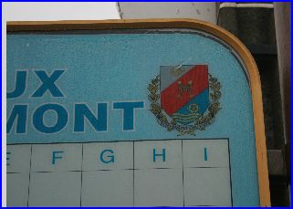 Tiercé en barre: au 1er d'argent à deux roues dentées d'or, engrenées en barre, celle du chef plus petite, au 2e de gueules à deux bars adossés d'or, au 3e d'azur à la roue de moulin d'or brochant sur une tierce ondée du même.