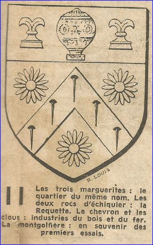 De gueules au chevron d'or chargé de cinq clous de sable et accompagné de trois marguerites d'argent boutonnées d'or; au chef d'azur chargé d'une montgolfière d'argent accostée de deux rocs d'échiquiers d'or.