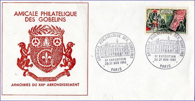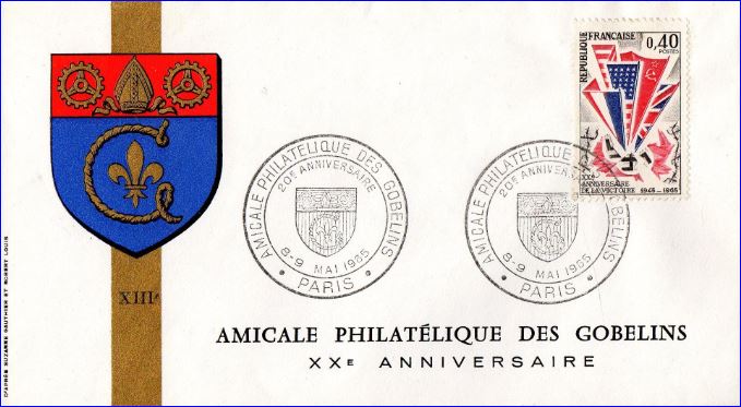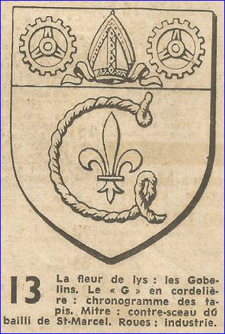 D'azur à la fleur de lis d'or enfermée dans une cordelette du même formant la lettre G; au chef cousu de gueules chargé d'une mitre d'or accostée de deux roues d'engrenage du même.