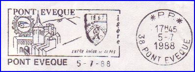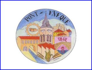 De pourpre au pont d'une arche d'or, maçonné de sable, pentu en barre à dextre, posé sur une rivière d'azur mouvant de la pointe, surmonté de l'inscription « 1867 » en chiffres de gueules, l'ouverture chargée d'une mitre de gueules ornée d'or, brochant sur la rivière.
