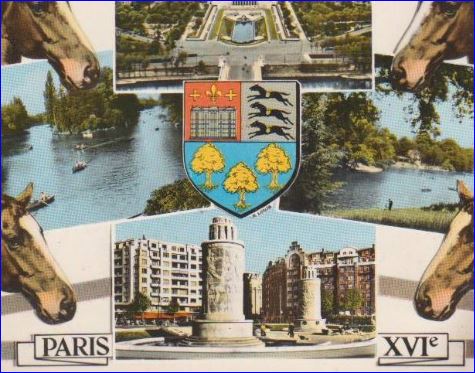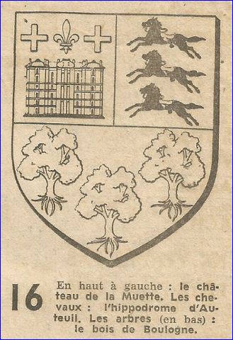 (1943) Coupé: au 1er parti au I de gueules au château de la Muette d'argent, ajouré du champ, accompagné en chef d'une fleur de lis d'or accostée de deux croisettes du même, au II d'argent à trois chevaux galopant de sable, bridés et sellés d'or, au 2e d'azur à trois arbres arrachés d'or, 2 et 1