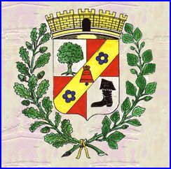 (1989) Écartelé: au 1er d'argent à l'arbre de sinople, aux 2e et 3e de gueules plain, au 4e d'argent à la botte de sable; à la barre d'or brochant sur le tout, chargée d'une cloche de gueules, posée à plomb, bataillée d'azur et accompagnée de deux angemmes du même.