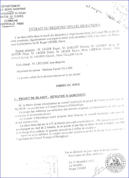 (2002) De gueules au chevron d'argent accompagné en chef de deux besants et en pointe d'une tête de daim, le tout du même; au chef d'or chargé d'un château de gueules accosté de deux trèfles de sinople.