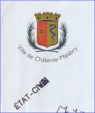 Parti: au 1er de gueules à la branche de châtaignier d'or fruitée d'argent, au 2e d'or à la couleuvre tortillée d'azur en pal.