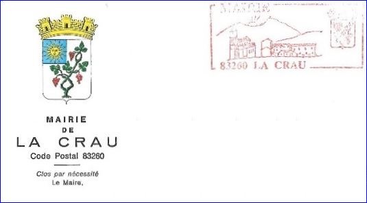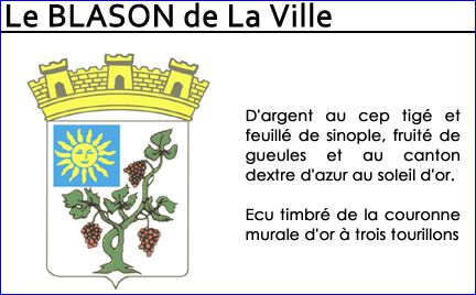 (1973) D'argent au cep tigé et feuillé de sinople, fruité de gueules; au franc-canton d'azur chargé d'un soleil d'or.