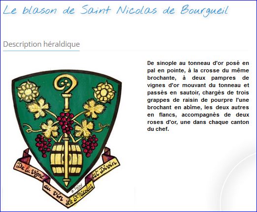 De sinople au tonneau d'or posé en pal en pointe, à la crosse du même brochante, à deux pampres de vignes d'or mouvant du tonneau et passés en sautoir, chargés de trois grappes de raisin de pourpre l'une brochant en abîme, les deux autres en flancs, accompagnés de deux roses d'or, une dans chaque canton du chef.