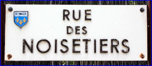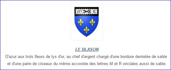 D'azur à trois fleurs de lis d'or; au chef d'argent, chargé d'une paire de ciseaux accostés des lettres onciales M et R le tout de sable, le chef bordé dentelé du même.