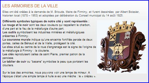 (1925) Parti de sable et de gueules ; à deux pics en sautoir, une enclume, à la lampe de mineur appendue à une roue d'engrenage, tous d'or et brochant chacun sur le précédent en coeur, au clou de sable brochant au centre de la roue d'engrenage, le tout accompagné au canton senestre du chef d'une «apeau» [ou basane, tablier de cuir des cloutiers] d'argent chargé en coeur d'une meule de gueules; au franc-canton d'or chargé de deux clefs renversées de sable passées en sautoir.