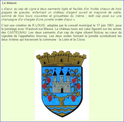 (1961) D'azur au cep de vigne à deux sarments tigés et feuillés d'or, fruités chacun de trois grappes de gueules, enfermant un château d'argent, ouvert et maçonné de sable, sommé de trois tours d'argent couvertes et girouettées de sable; ledit cep posé sur une champagne d'or, chargée d'une jumelle ondée d'azur.