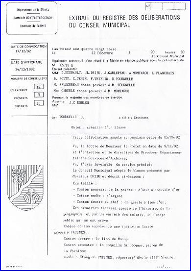 (1992) Taillé: au 1er de gueules au lion d'or, au 2e d'azur à la coquille d'or; à la cotice en barre ondée d'argent brochant sur la partition.