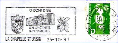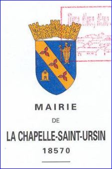 D'azur à la bande d'or chargée de trois tiercefeuilles de gueules, accompagnée en chef de saint Ursin bénissant, mitré et crossé d'or et en pointe d'une chapelle du même.