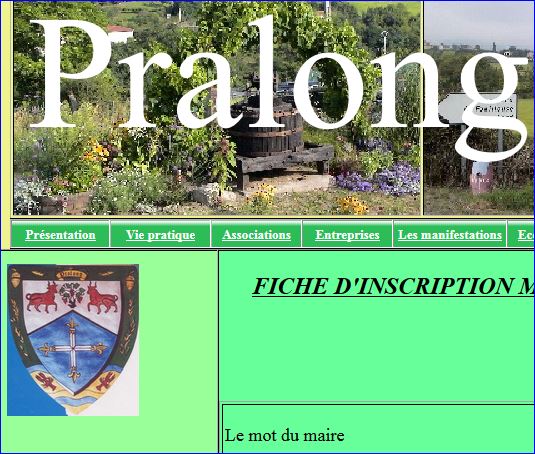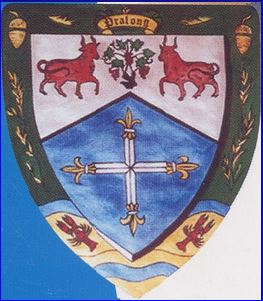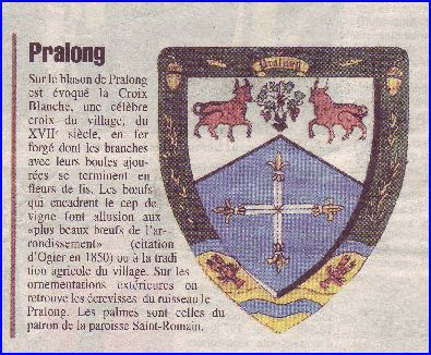 (2003) D'azur à la croisette d'argent fleurdelisée d'or; mantelé d'argent chargé d'un cep de vigne de sable, feuillé de sinople et fruité de gueules, accosté de deux boeufs affrontés de gueules.