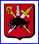 De gueules à la crosse d'or et à l'épée basse d'argent garnie d'or, passées en sautoir, surmontées d'une lampe de mineur d'argent, allumé du champ, au sanglier de sable brochant sur le tout.