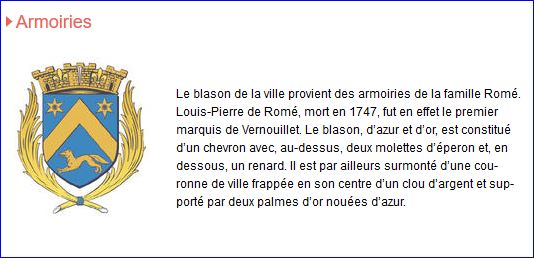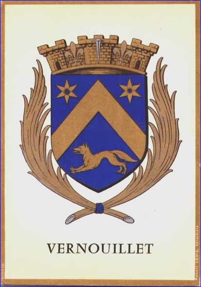 D'azur au chevron d'or accompagné en chef de deux molettes et en pointe d'un renard courant du même.
