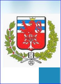 Coupé: au 1er d'argent à deux fasces d'azur, au lion issant de gueules, couronné d'or, brochant sur le tout, au 2e de gueules au chêne d'argent.
