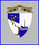 Parti: au 1er mi-parti tranché abaissé d'azur et d'argent au cédratier [citronnier] arraché de tenné en redorte, feuillé de sinople et fruité d'or, au 2e d'argent au navire sans voile contourné de sable sur une champagne ondée d'azur chargée en chef d'une tierce ondée d'argent.