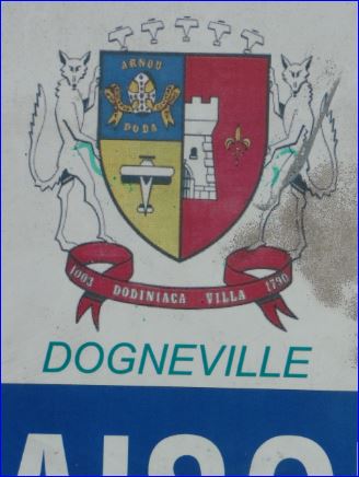 Parti: au 1er coupé au I d'azur à la mitre avec ses fanons déployés d'or chargée d'une croix d'argent ornée de sept pierres de gueules accompagnée des inscriptions « ARNOU » en chef et « DODA » en pointe en lettres capitales d'or, au II de sinople à l'avion montant d'argent; au 2e mi-parti de gueules à la tour d'argent ajourée et maçonnée de sable, accostée de deux fleurs de lis d'or.