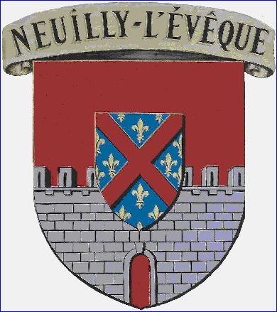 De gueules au mur crénelé d'argent ouvert du champ, maçonné de sable, mouvant de la pointe; à l'écusson d'azur semé de fleurs de lis d'or et au sautoir de gueules, brochant en coeur sur le tout.