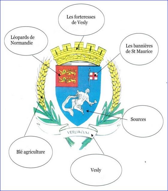 (1998) D'azur au personnage d'argent représentant une source, surmonté à senestre de la bannière de saint Maurice, d'argent à la croix de gueules; au franc-quartier de gueules chargé de deux léopards d'or armés et lampassés d'azur, l'un au-dessus de l'autre.