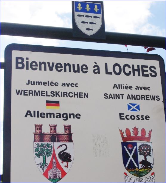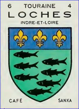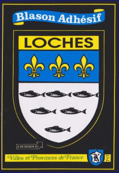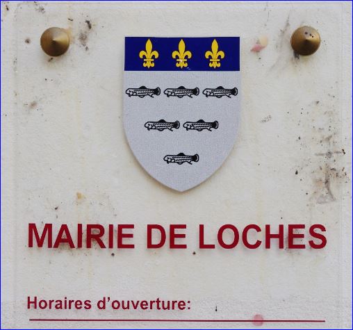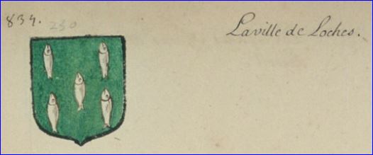 D'argent à six loches [poissons] de sable, posées en fasce et ordonnées 3, 2 et 1; au chef d'azur chargé de trois fleurs de lis d'or.