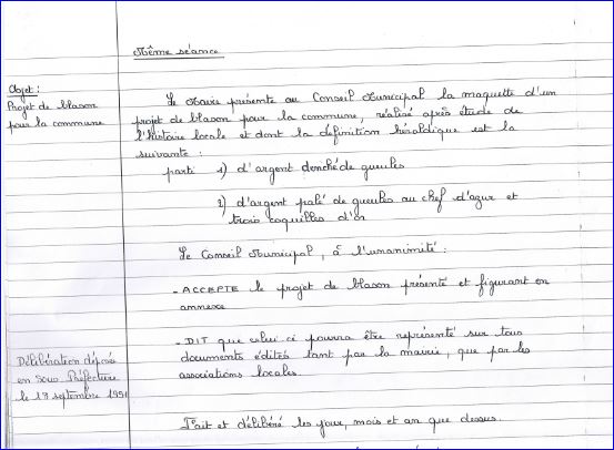 (1991) Parti: au 1er coupé denché d'argent et de gueules, au 2e palé d'argent et de gueules et au chef d'azur chargé de trois coquilles d'or.