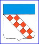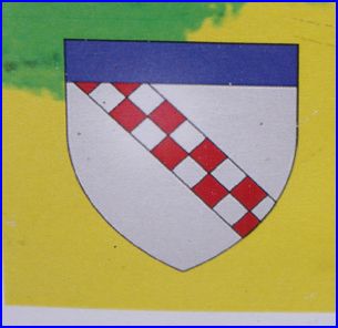 D'argent à la bande échiquetée de gueules et d'argent de deux tires; au chef d'azur.