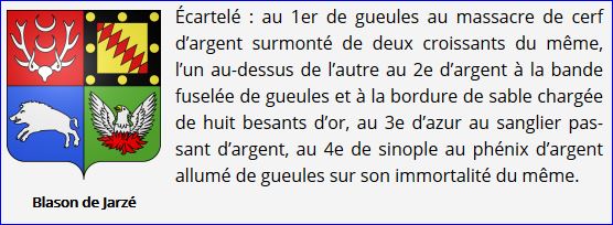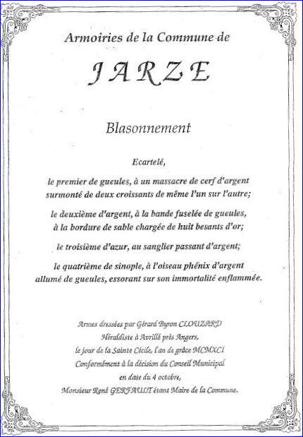 (1991) Écartelé: au 1er de gueules au massacre de cerf d'argent surmonté de deux croissants du même, l'un au-dessus de l'autre, au 2e d'argent à la bande fuselée de gueules et à la bordure de sable chargée de huit besants d'or, au 3e d'azur au sanglier passant d'argent, au 4e de sinople au phénix d'argent allumé de gueules sur son immortalité du même.