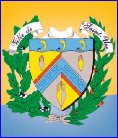 Divisé en chevron et parti d'or et d'argent, à trois amphores, celle de la pointe plus grande et brochante, le tout de l'un en l'autre; au chevron d'argent chargé de deux jumelles potencées imbriquées intérieurement d'azur, bordé en filet de gueules en chef à dextre et soutenu à senestre, les deux bâtons mouvant du trait du parti, le tout brochant sur la partition; au comble ondé d'azur chargé de trois dauphins d'or.