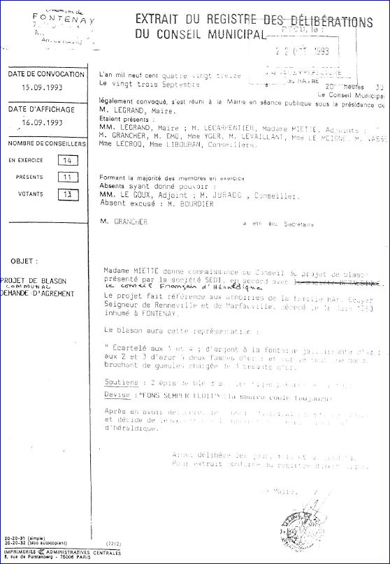 (1993) Écartelé: aux 1er et 4e d'argent à la fontaine de deux bassins, jaillissante d'azur, aux 2e et 3e d'azur à deux fasces d'or; à la barre de gueules chargée de trois besants d'or, brochant sur le tout.