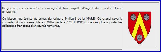 (1985) De gueules au chevron d'or accompagné de trois coquilles d'argent.