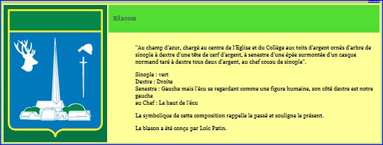 D'azur à la représentation du village avec son clocher en aiguille d'argent agrémenté d'arbres de sinople, accompagné en chef, à dextre, d'une tête de cerf contournée, à senestre, d'un casque normand à nasal, taré de profil et soutenu d'une épée basse, le tout d'argent; au chef de sinople plain soutenu d'un filet d'or.