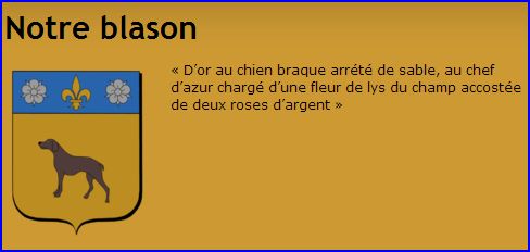 D'or au chien braque arrêté de sable; au chef d'azur chargé d'une fleur de lis d'or accostée de deux roses d'argent.