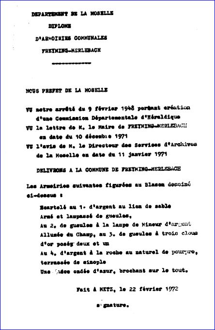 (1972) Coupé au 1er de gueules à la lampe de mineur d'argent, allumée du champ, à senestre, au 2e parti au I de gueules à trois clous d'or, au II d'argent à la roche de pourpre terrassée de sinople; à la fasce ondée d'azur brochant sur le coupé; au franc quartier d'argent au lion de sable, armé et lampassé de gueules.