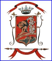 De gueules au heaume de tournoi d'or, fermé, taré de profil, aux lambrequins du même au retroussis d'argent, soutenu d'une trangle ployée d'or, haussée à senestre et chargée de l'inscription de sable «IN VINO VERITAS», accompagnée en pointe de deux grappes de raisin d'azur feuillées d'or.
