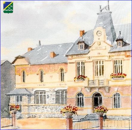 Taillé: au 1er d'azur au soleil levant d'or, au 2e de sinople à deux brebis d'argent rangées en barre; au bâton en barre d'or brochant sur la partition ; à la burelle ondée d'argent surbrochant en pointe.