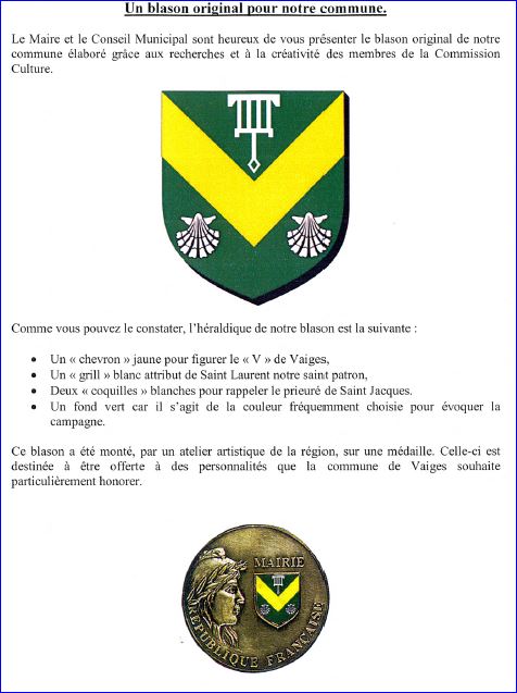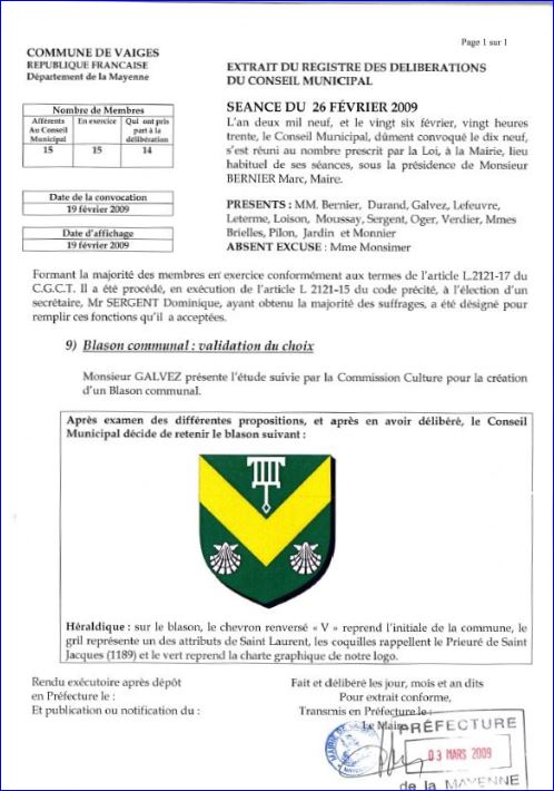 (2009) De sinople au chevron renversé d'or accompagné en chef d'un gril d'argent, posé en pal la poignée en bas et en pointe de deux coquilles du même.