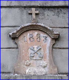 De gueules à deux clefs d'argent passées en sautoir, les pannetons affrontés, accompagnées en chef d'une fleur de lis d'or.