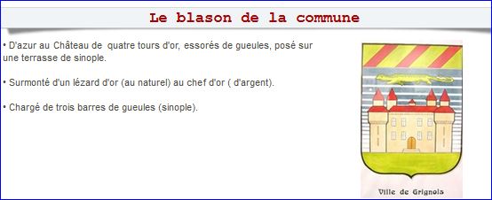 D'azur au château de quatre tours d'or, essoré de gueules, posé sur une terrasse de sinople, surmonté d'un lézard d'or; au chef d'or chargé de trois barres de gueules.