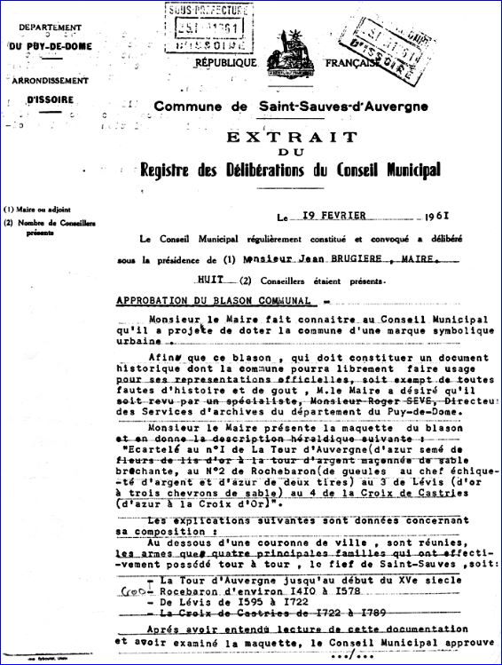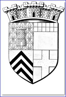 (1961) Écartelé: au 1er d'azur semé de fleurs de lis d'or, à la tour d'argent maçonnée de sable brochant sur le tout, au 2e de gueules plain au chef échiqueté d'azur et d'argent de deux tires, au 3e d'or à trois chevrons de sable, au 4e d'azur à la croix d'or.