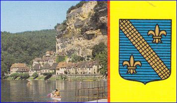 D'azur à la bande d'or frettée (grillagée) de sable, accompagnée de deux fleurs de lis d'or.