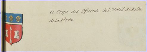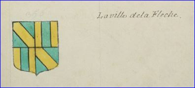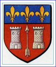 (1664, 1961) De gueules à la flèche d'argent posée en pal la pointe haute, accostée de deux tours du même maçonnées de sable; au chef cousu d'azur chargé de trois fleurs de lis d'or.
