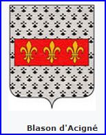 D'hermine à la fasce alésée de gueules chargée de trois fleurs de lis d'or.