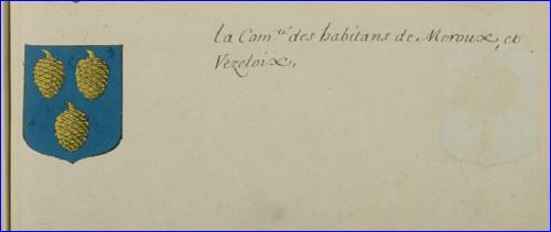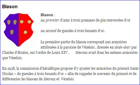 'Les armoiries actuelles de Meroux, telles qu'elles figurent sur le papier à en-tête de la commune ont été proposées par la commission départementale d'héraldique en sa séance du 10 mai 1958.